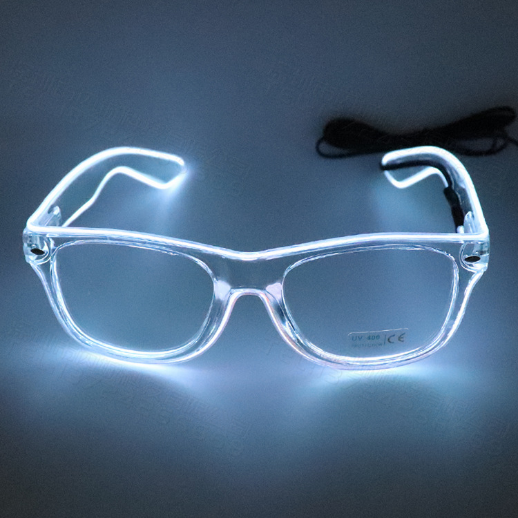 Светодиодные очки имеют прозрачную оправу, прозрачные линзы. Работают от двух батареек 2АА