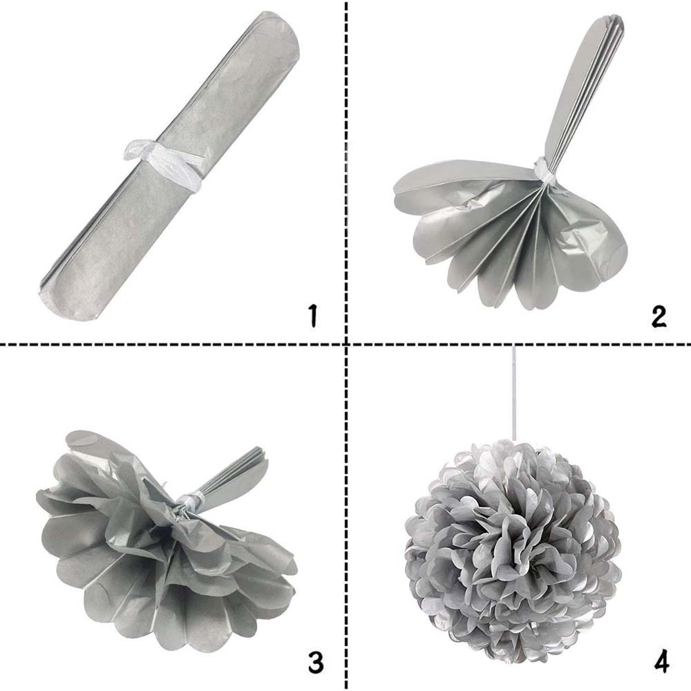 Серебряный бумажный помпон диаметром 35 см — стильное и лёгкое украшение для праздников, фотозон, витрин и интерьера. Отлично подойдёт для дней рождений, свадеб, вечеринок и тематических мероприятий.