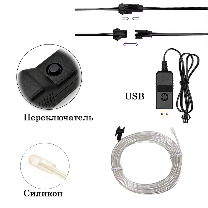 Шнур работает от стандартного USB-порта (5V) - подключается к PowerBank, компьютеру или сетевому адаптеру (в комплект блок питания не входит).